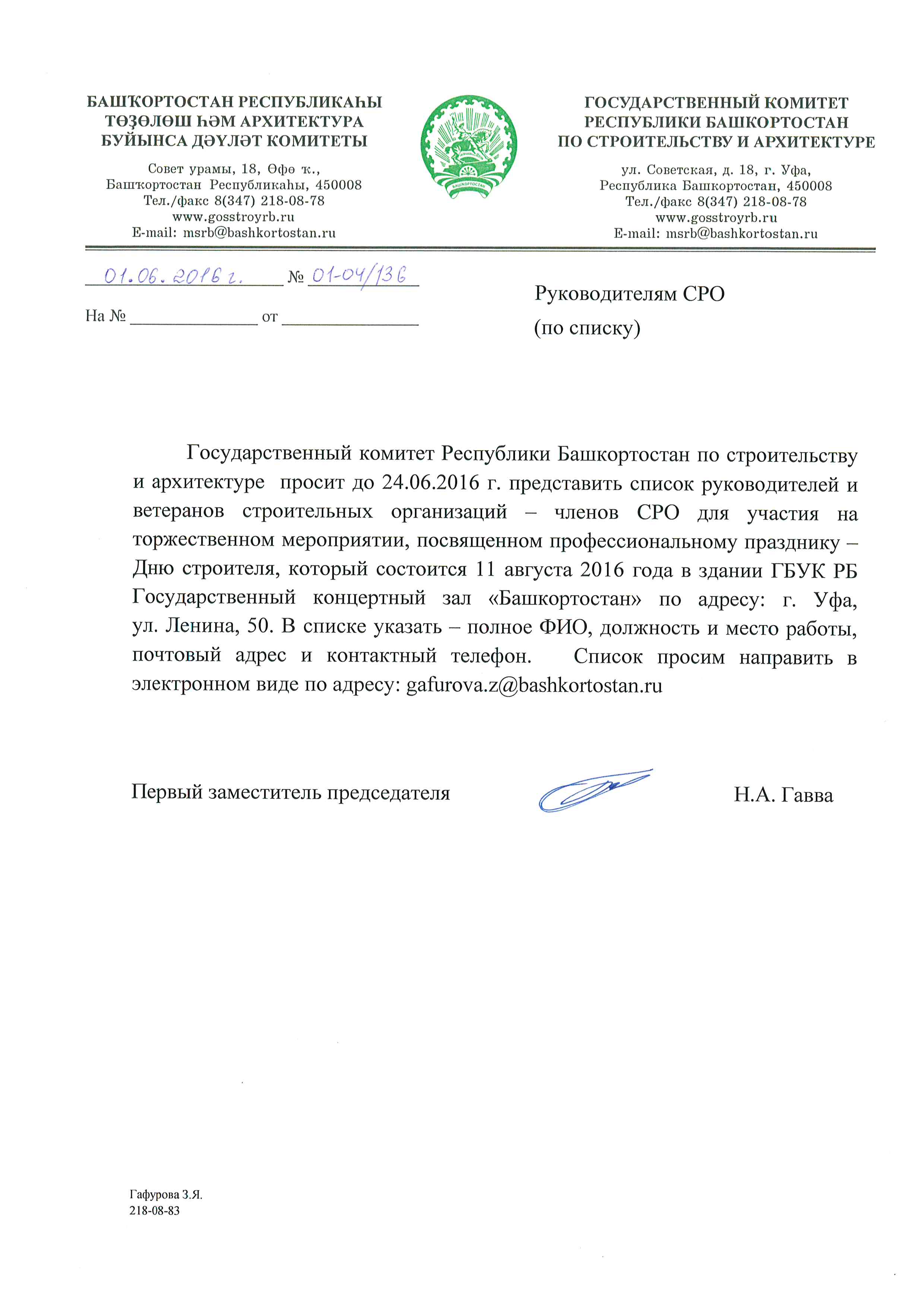 Государственный комитет Республики Башкортостан по строительству и архитектуре просит до 24.06.2016 предоставить списки руководителей и ветеранов строительных организаций для участия на торжественном мероприятии, подробней см. приложения